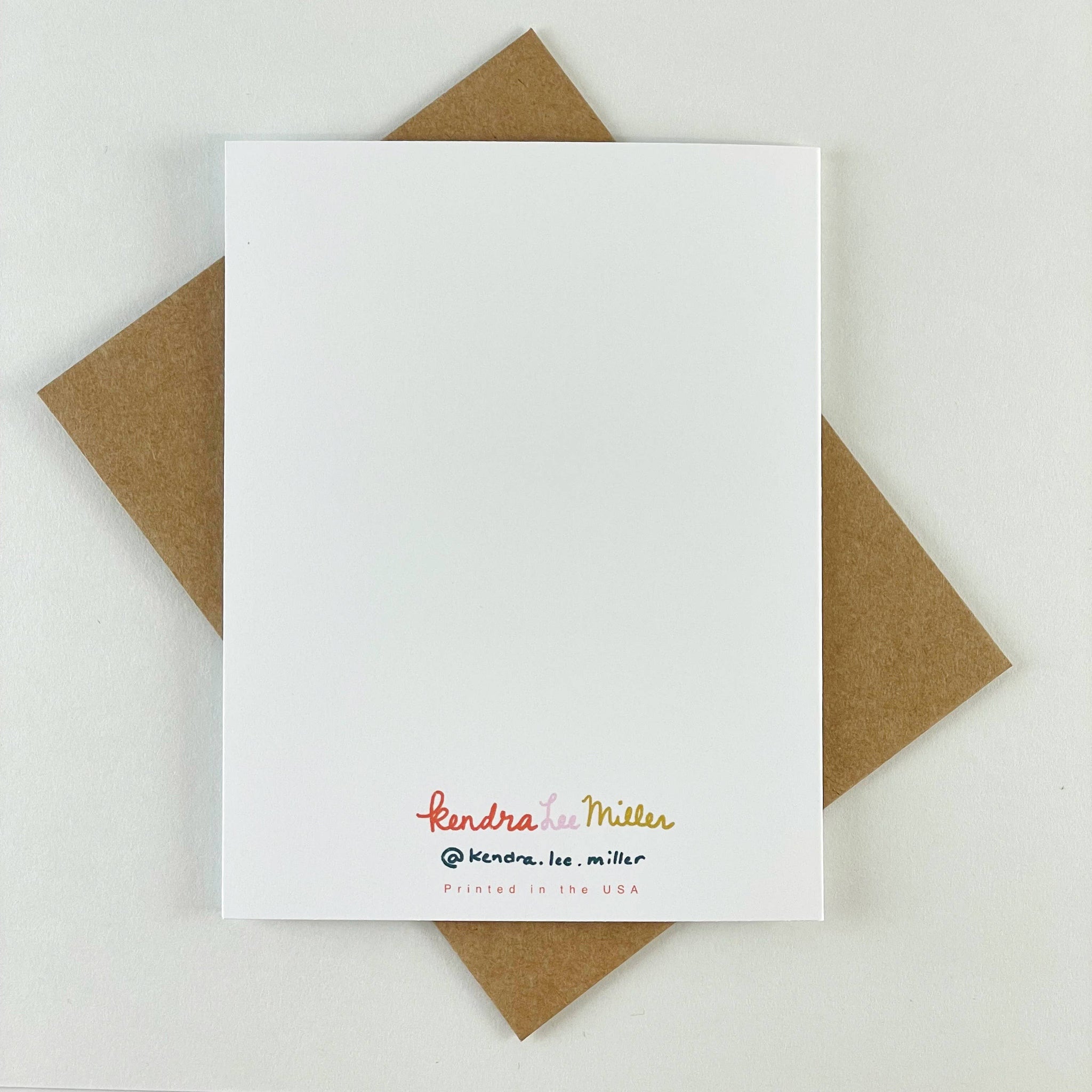 A Kendra Lee Miller original design of a worm celebrating it's birthday! Weird? Yes. Cute? Also yes. -Card Measures 4.25 x 5.5 inches -Printed on recycled 110 lb white cardstock with archival ink. -Each card comes with a recyclable cello sleeve and coordinating envelope.