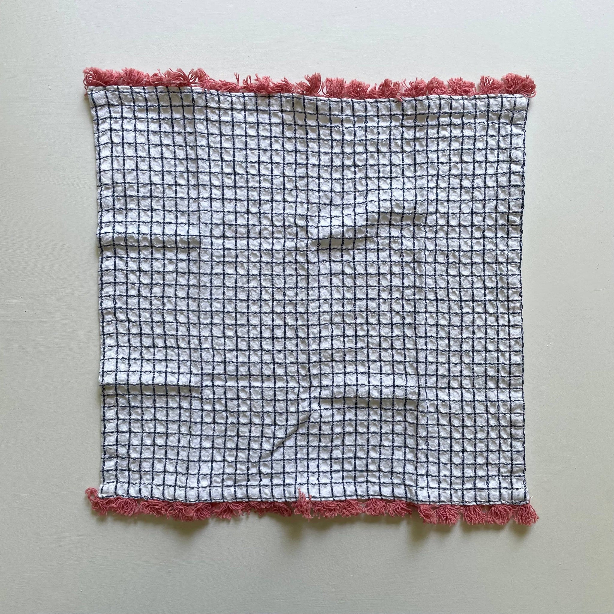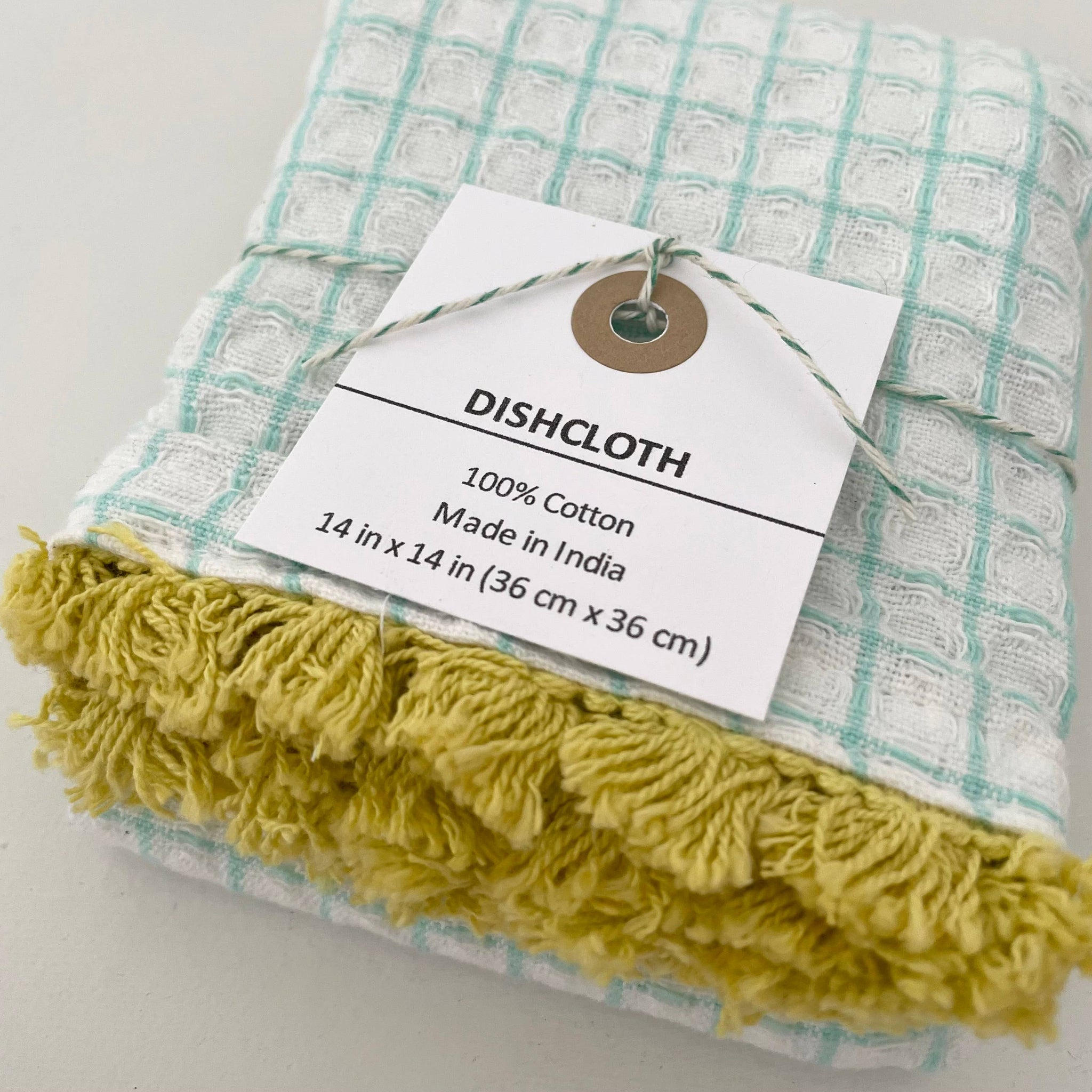 A fun pop of color for the kitchen! Or, a unique gift! 100% cotton. Each dishcloth measures approx. 14" square. Corner loop for hanging. Machine wash warm in a delicates bag to prevent snagging, line dry. No bleach. Use press cloth if ironing. Some shrinkage may occur, as with any cotton items. Made in India. Packaged in Japan (fabric care label is in Japanese). Dishcloths are tied together with bakers twine and a hang tag (in English)..