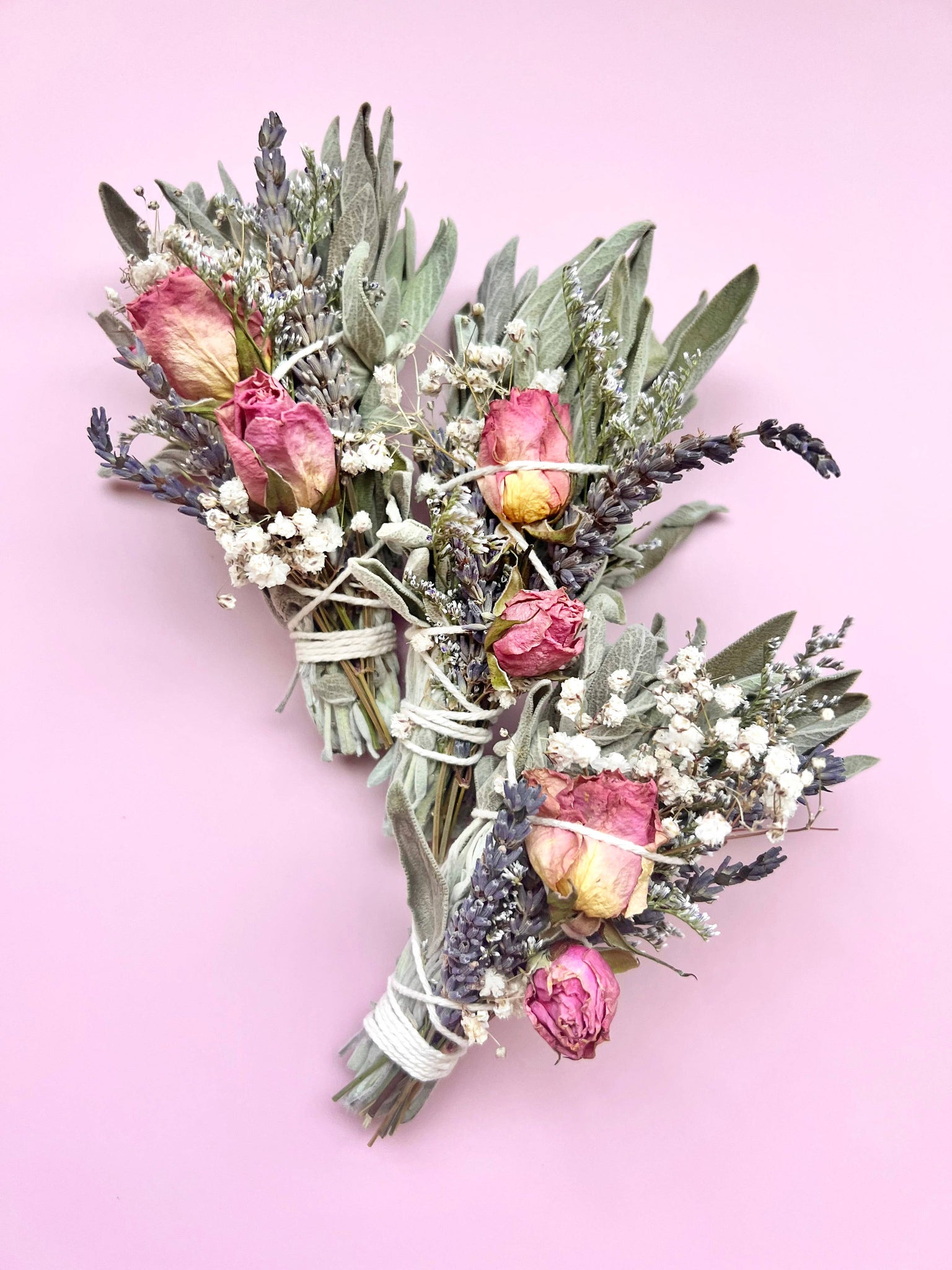 Sustainably sourced & Hand-tied in SWFL. Perfect MINI bundles for cleansing rituals! Great for gifting & to cleanse any tired spaces! These are also a favorite to create custom kits & gifting boxes! D E T A I L S : -Green Sage -Wildflowers (colors will vary- creams/pinks/lavenders) -Spray Roses or other wildflowers depending on season (colors will vary) -Babies Breath -Cotton String -Instructional Cleansing Card -Approximately 4" in length