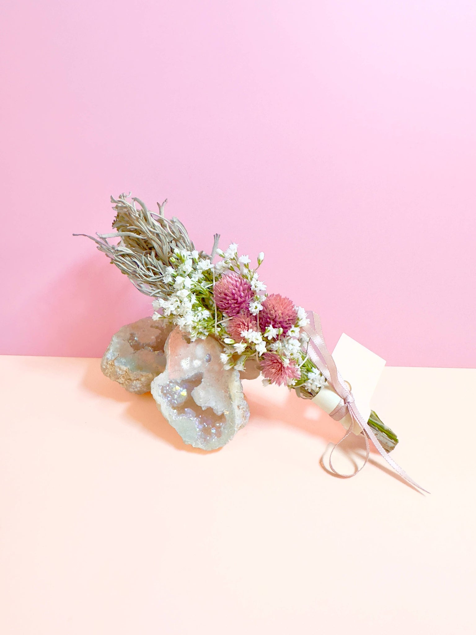 Sustainably sourced & Hand-tied in SWFL. A nice thin bundle easy to gift and use. Perfect MINI bundles for cleansing rituals! Great for gifting & to cleanse any tired spaces! These are also a favorite to create custom kits & gifting boxes! D E T A I L S : -Blue Sage -Babies Breath -Dried Gomphrena Blooms ( Colors vary between pinks, lavender and purple) -Cotton String -Tag with floral info- Approximately 4" in length