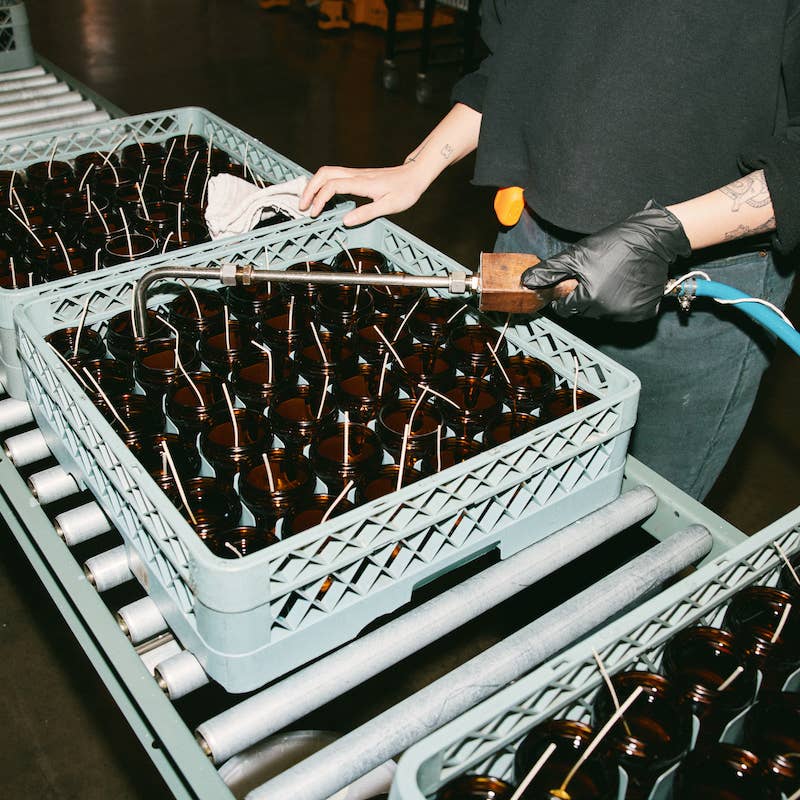 Our candles are simple - they're all made with 100% domestically grown soy wax, fine fragrance oils, and cotton-core wicks. The fragrances we use are paraben-free, phthalate-free, and never (ever) tested on animals.