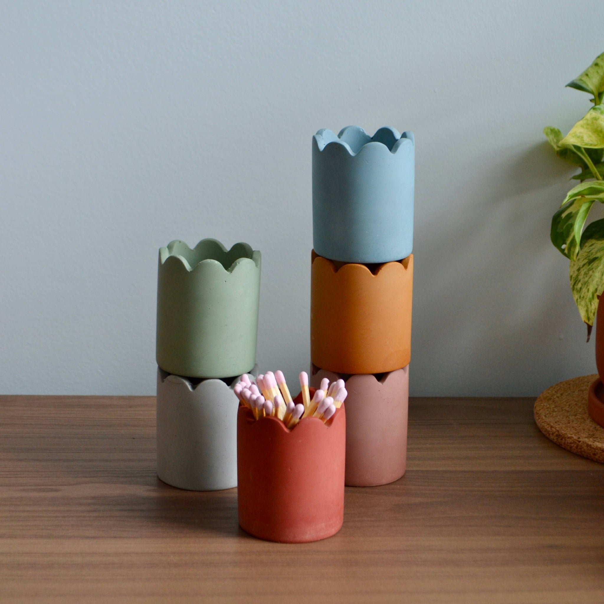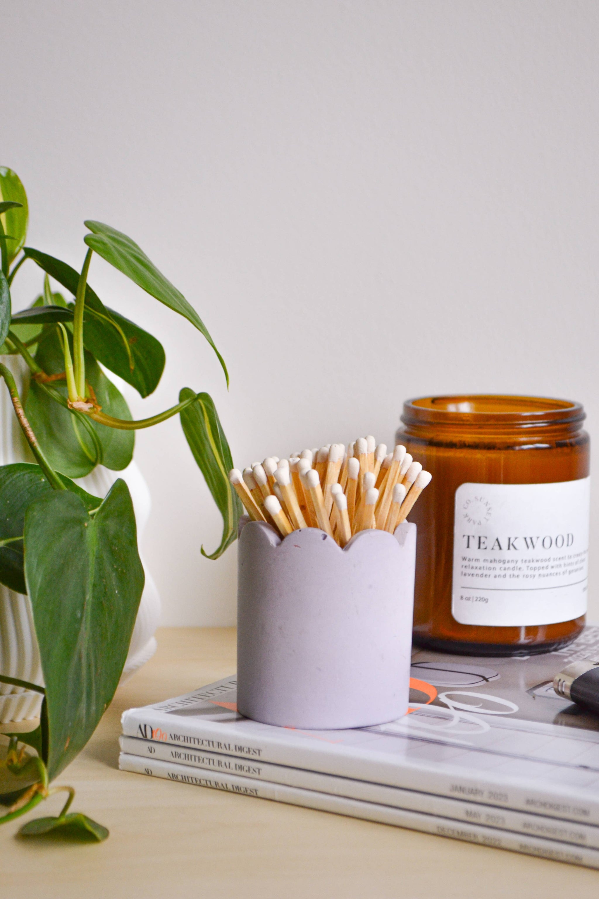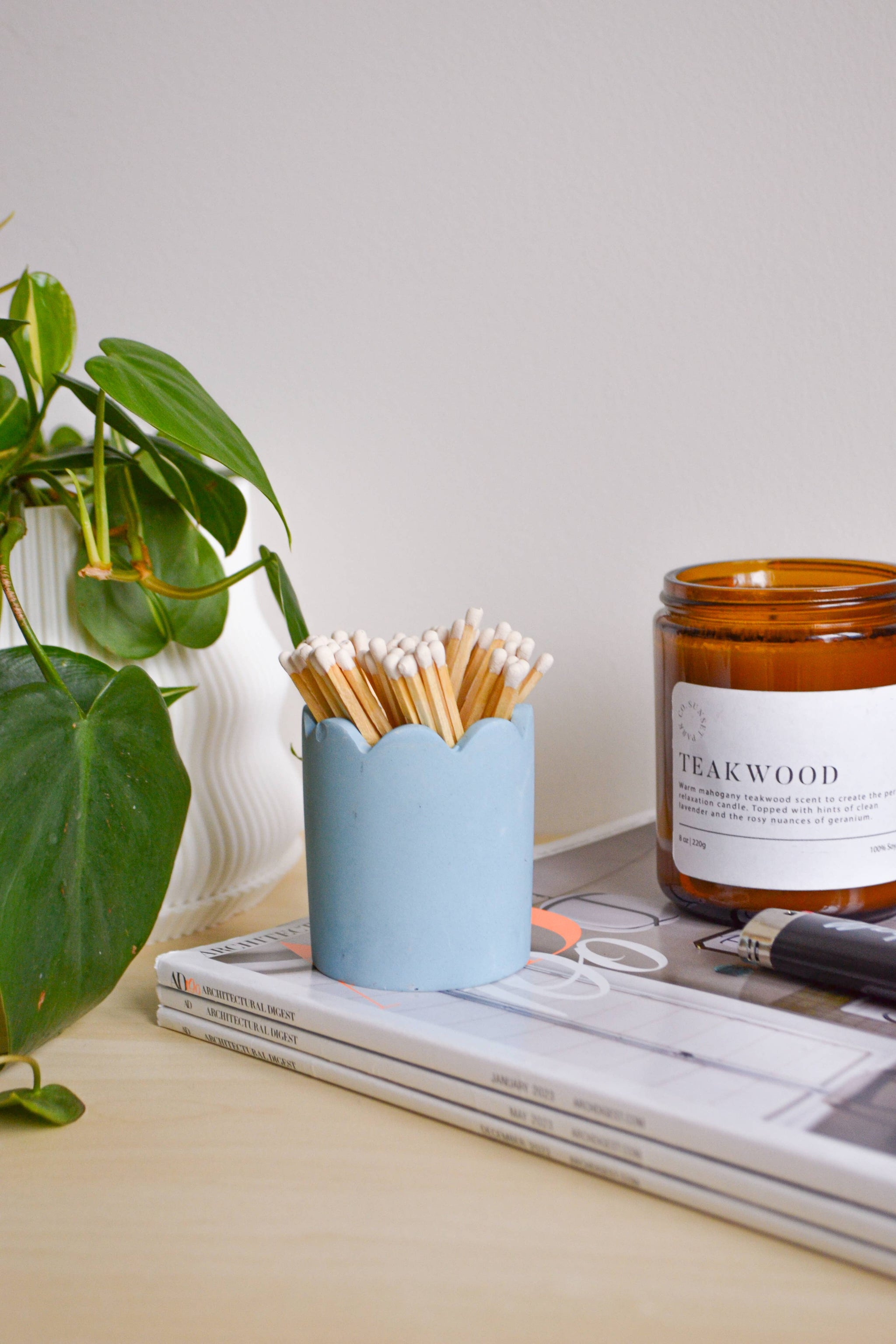 Concrete Matchstick Holder with Striker sticker on bottom of vessel Add a touch of industrial charm to your space with this sleek, handmade concrete matchstick holder. Perfectly designed to hold your matches in style, this holder comes complete with striker stickers and a bundle of matches, making it both functional and eye-catching. Whether placed on your kitchen counter, fireplace mantel, or coffee table, it serves as a unique and practical decor piece. The minimalist design and sturdy concrete construction offer a modern twist on everyday essentials—keeping your matches organized and within easy reach while complementing any decor style. Light up your space in style with this must-have accessory! About: • Comes in multiple colors • Comes with a match striker on the bottom of vessel • Handmade in Brooklyn, NY