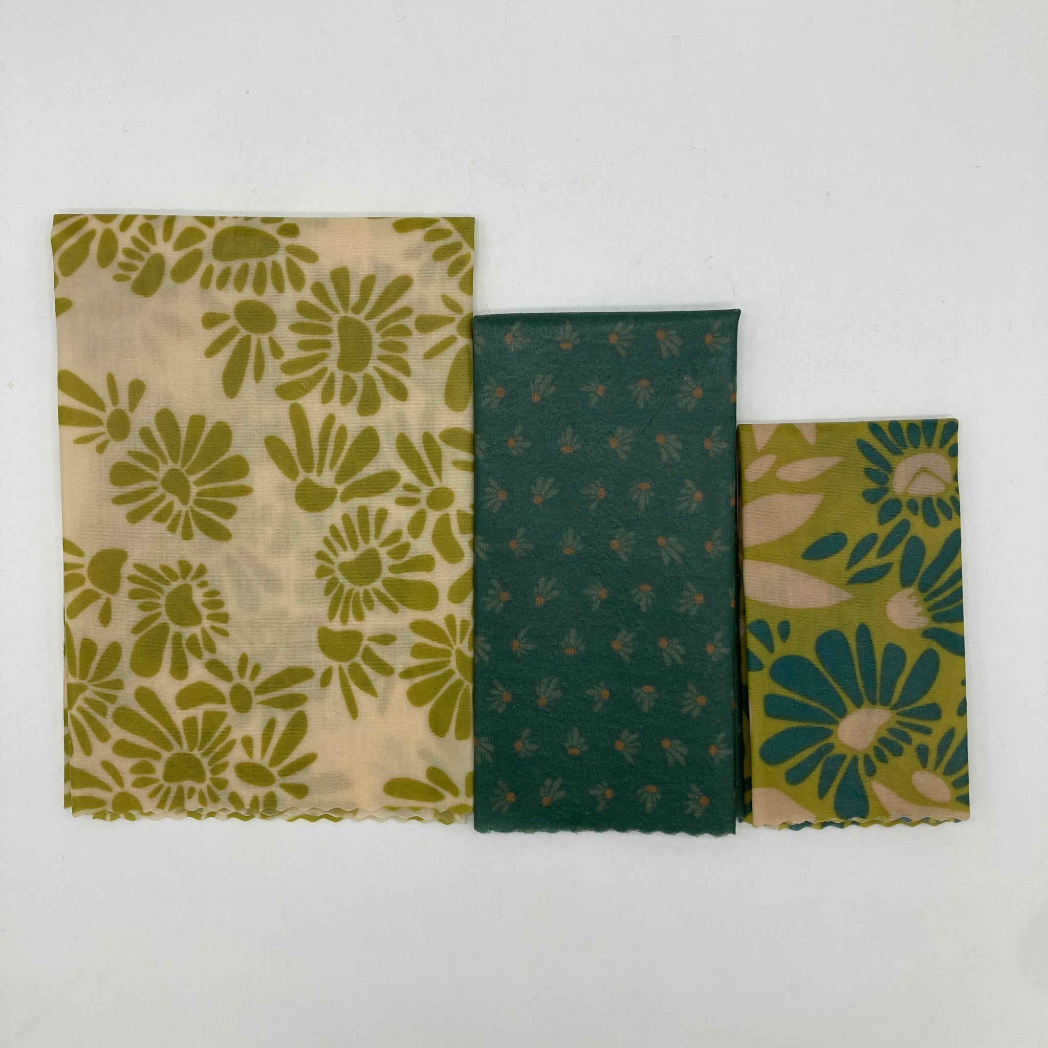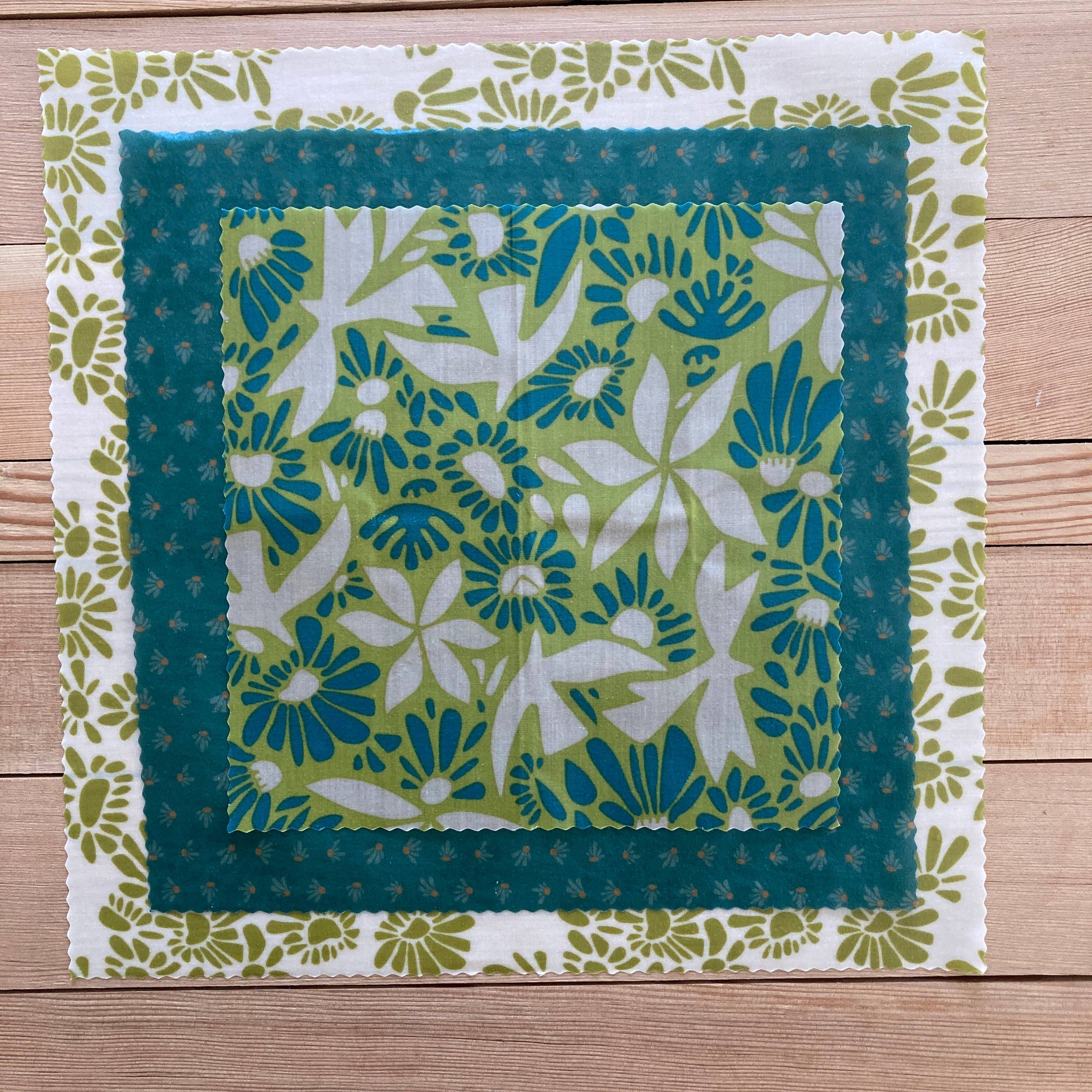 Starter Sets include 3 wraps for all kinds of foods or containers: - 8" x 8", 10" x 10", 12" x 12" We strive to have a design for every kitchen. For this reason our inventory changes often with new designer patterns. Beeswax wraps are a beautiful, sustainable, and reusable alternative to plastic wrap. They are all-natural, effective, and with normal use will last one year or more. To wash, use cold water and, if necessary, mild soap. Air dry. The easier you are on the wraps, the longer they'll last. At the end of their life, beeswax wraps are completely biodegradable and, as a pro-tip, a handy fire starter! Beeswax wraps work great to cover: Dishes Fruits and veggies Cheese Bread And much more Beeswax wraps are made of cotton, beeswax, pine resin, and jojoba oil. Cassidy and Micah hand-make these near Grand Rapids, Minnesota.