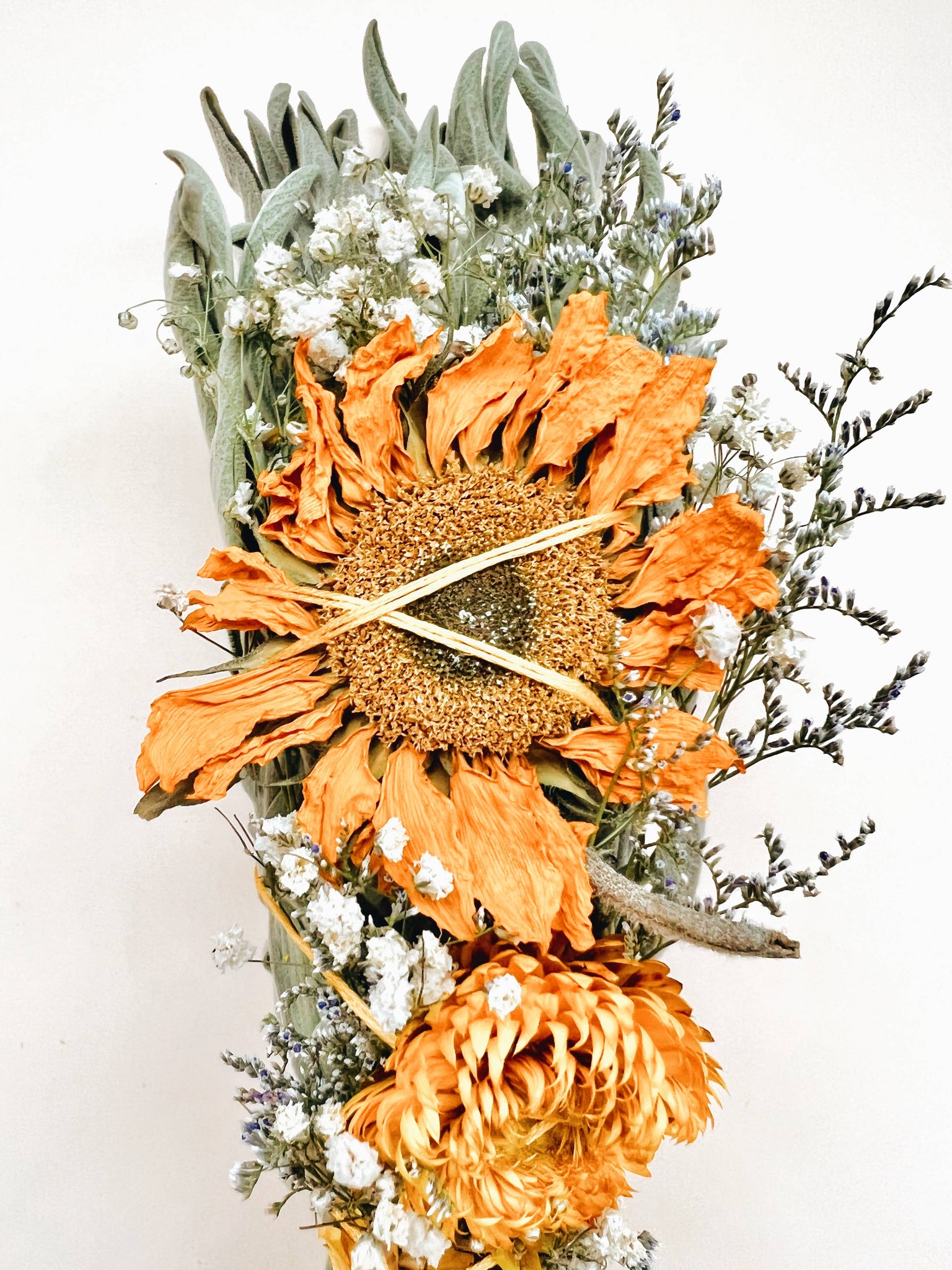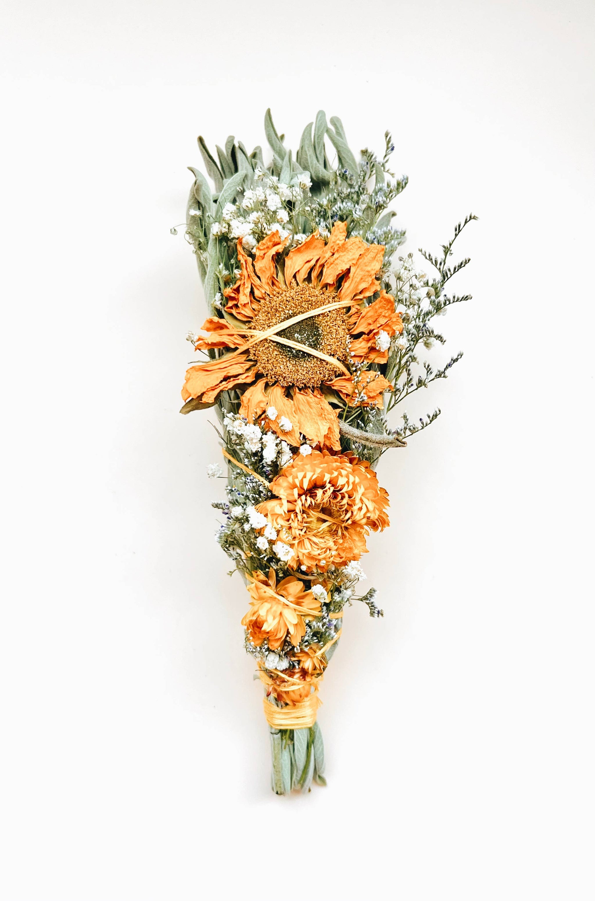 D E T A I L S : -Green Sage -Wildflowers (colors will vary- creams/yellow/lavenders) -Sunflower (not all bundles may feature a sunflower depending on availability) -Yellow Strawflowers -Babies Breath -Cotton String -Tag with floral info (not pictured) Approximately 9" in length *PLEASE NOTE SINCE THIS IS A HAND-MADE ITEM IT WILL VARY FROM BUNDLE TO BUNDLE BUT WE WILL DO OUR BEST TO KEEP IT AS SIMILAR TO THE PHOTOS AS POSSIBLE*