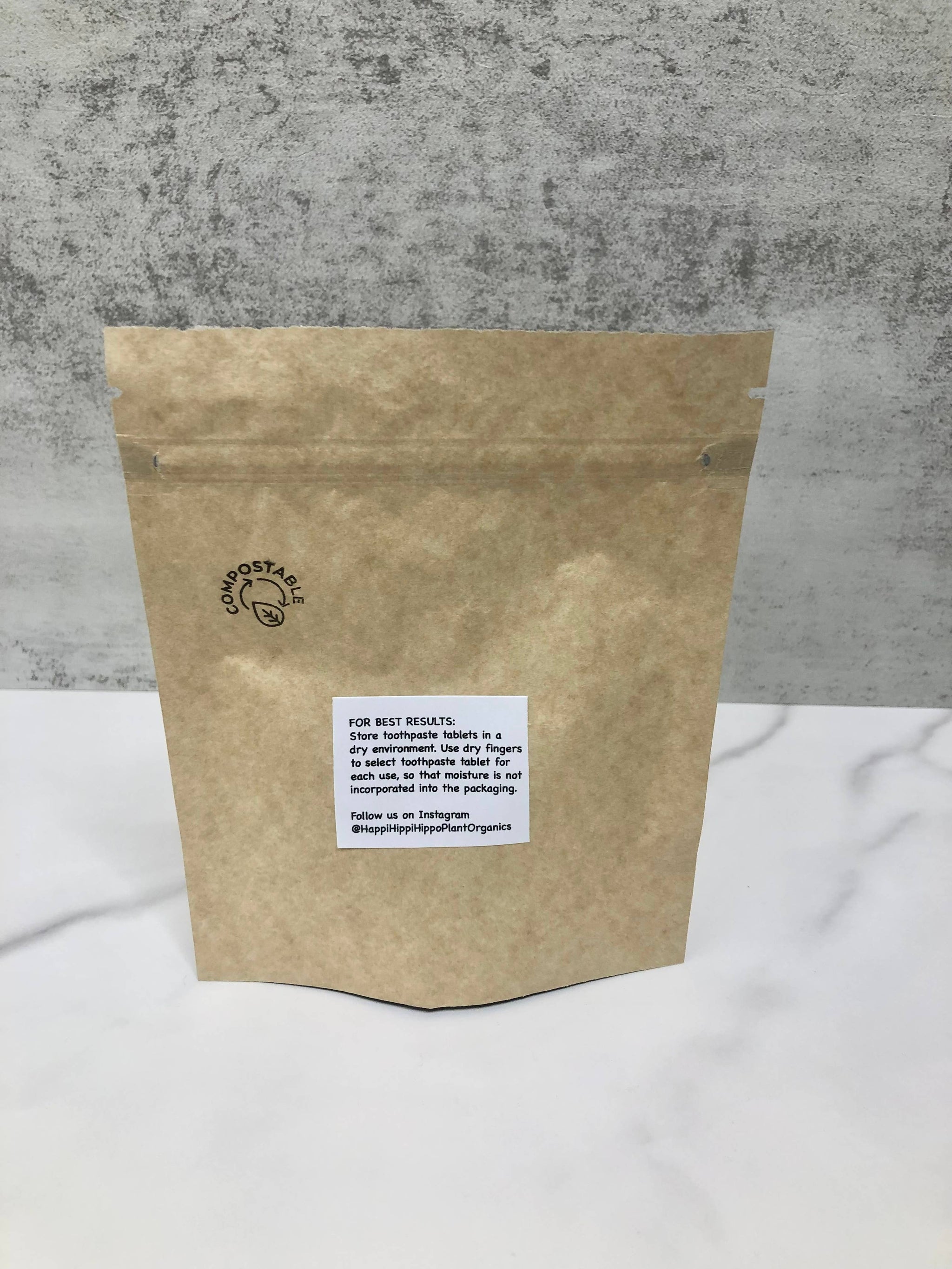 These are all natural toothpaste tablets in a resealable kraft pouch. 60 tablets in each pouch. These are great to take with you while camping, backpacking, traveling anywhere, or just to use at home.