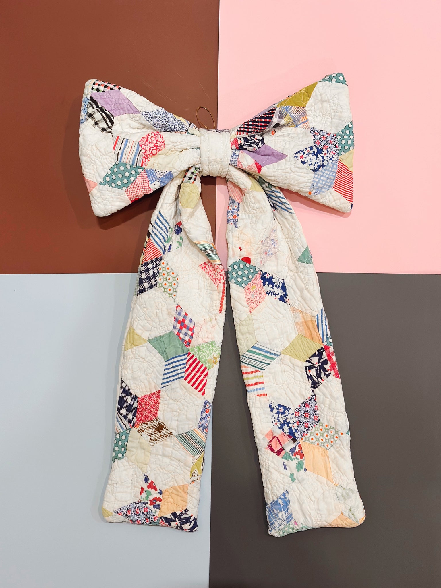 Darling quilt bow decor to hang on your wall or doorway. These are one-of-a-kind and will vary slightly.