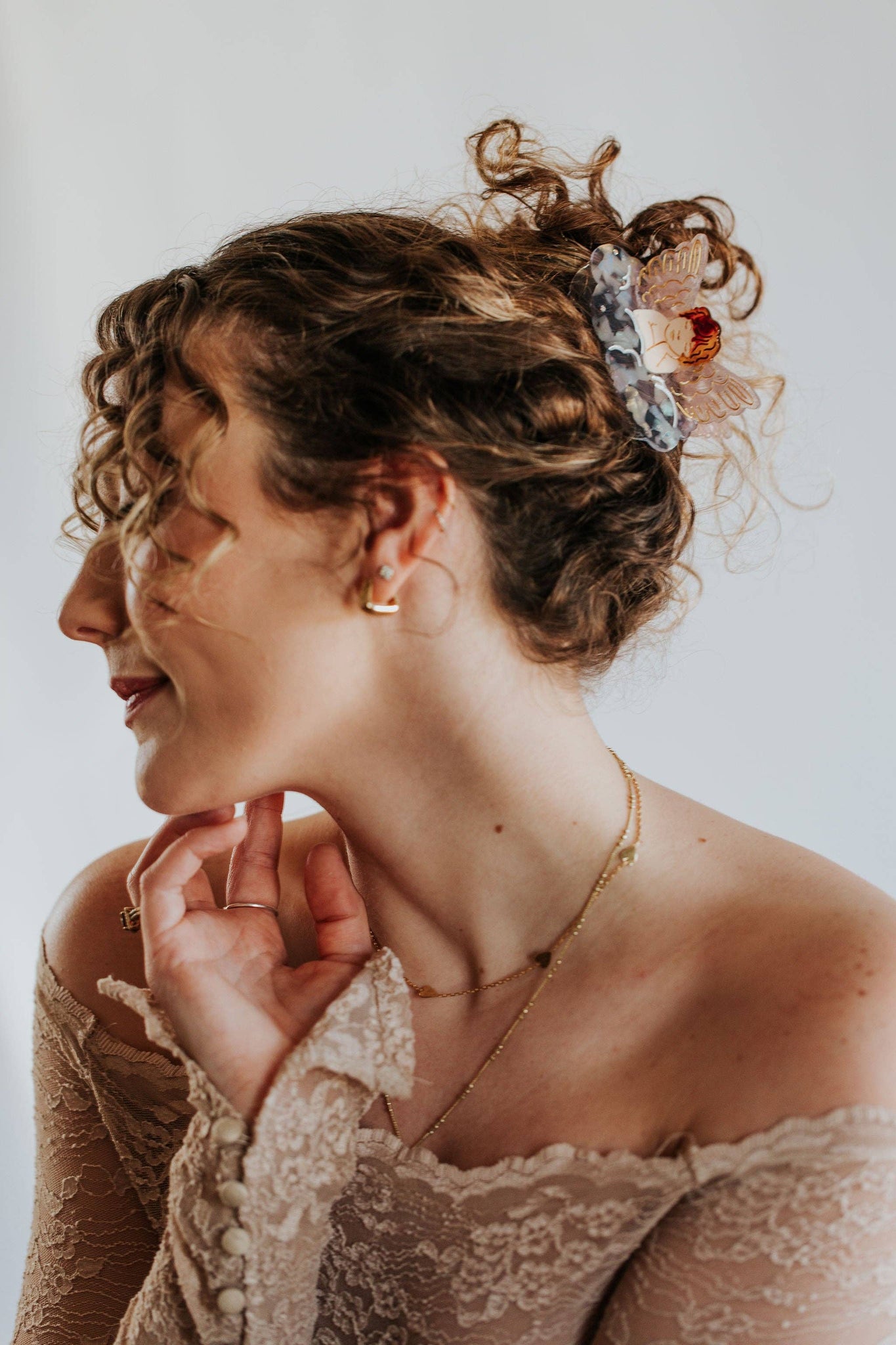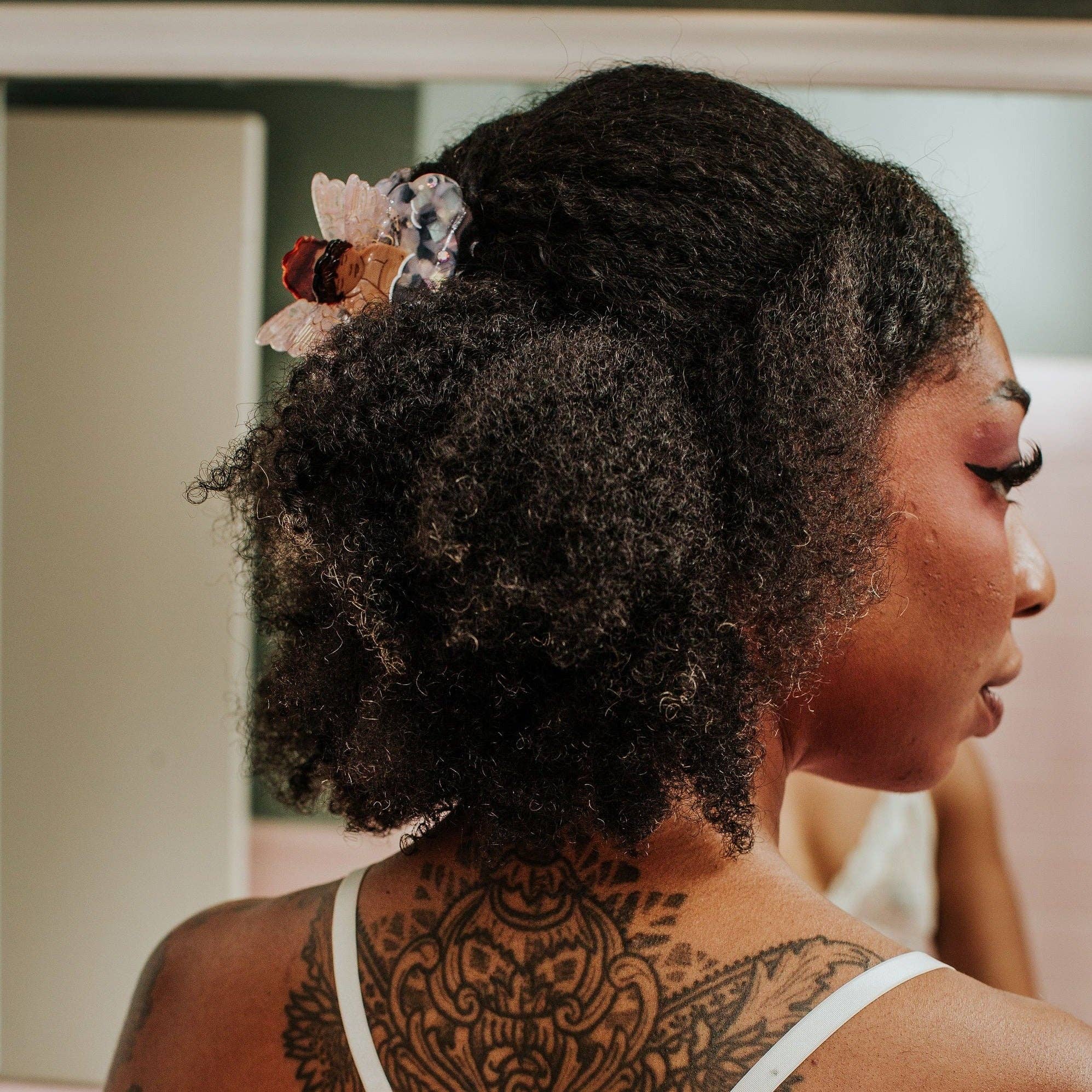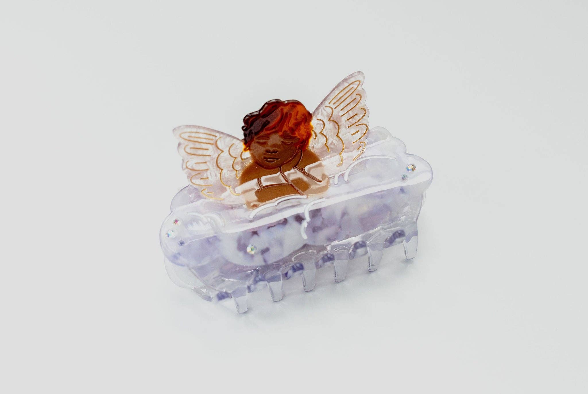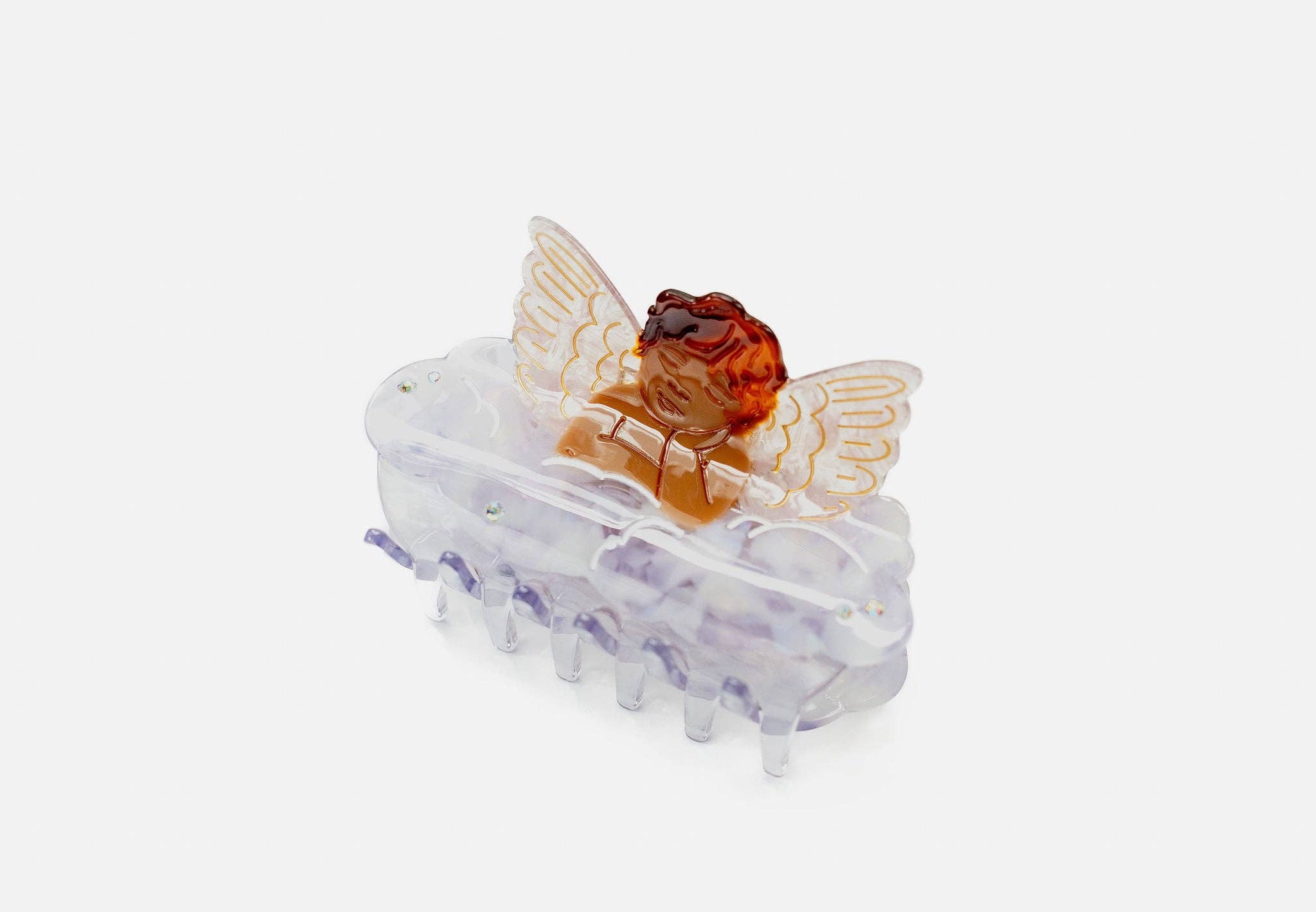 Nice hair, angel. The Angel Claw is a medium sized hair claw made for all hair types. Our signature angel design with translucent pink wings sits on top of a cloud with mother of pearl shine and engraved details. Completed with small gems, this dreamy piece catches every eye. Available in light and dark variants.